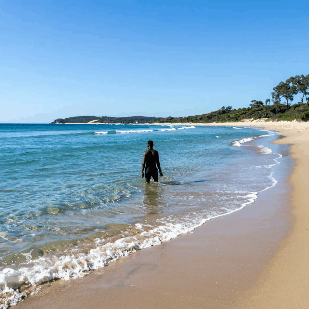 Algunas playas son más suaves que el mar abierto. Aquí sientes el impulso del agua salada y olas pequeñas y tranquilas. El agua suele ser poco profunda por un rato, lo que es más seguro para principiantes.